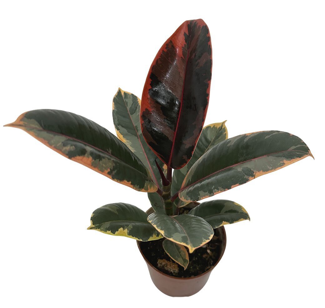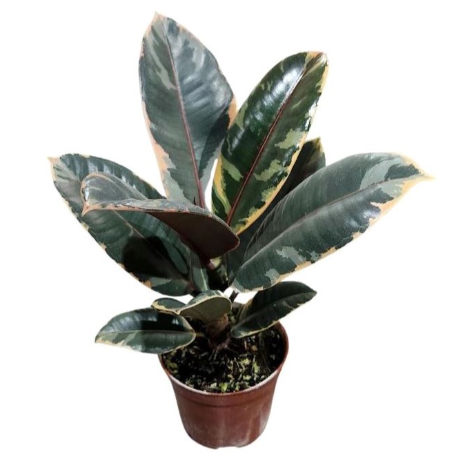 Один из самых красивых сортов каучуконосного фикуса. Его крупные листья украшены сочетанием тёмно-зелёных, кремовых и розовых оттенков, что делает растение ярким акцентом в интерьере.